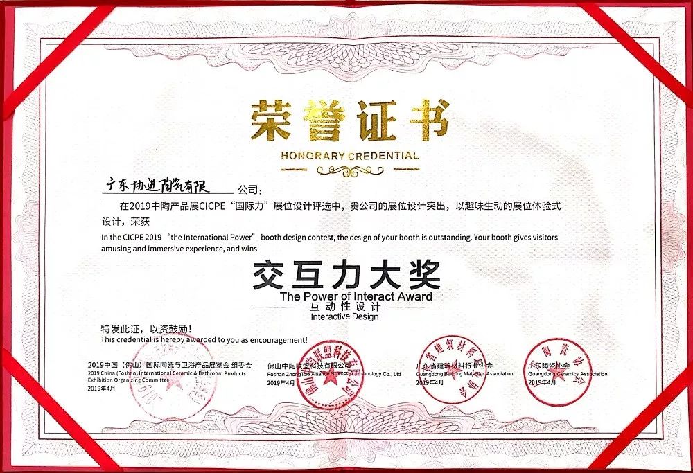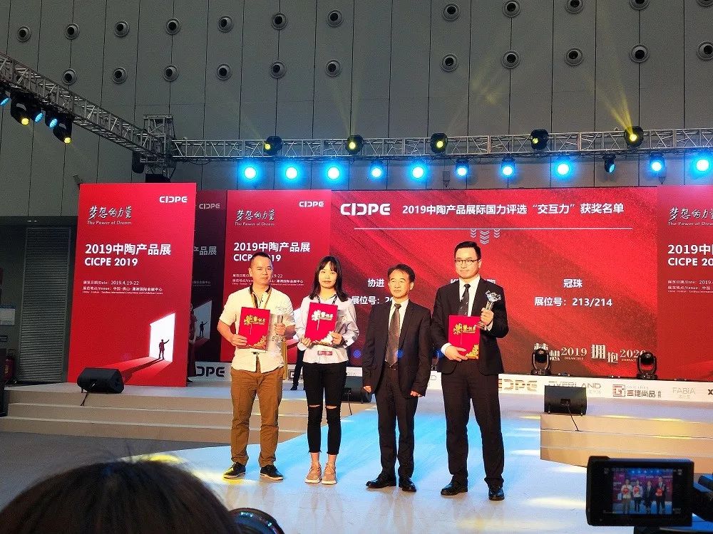 4月22日上午,在2019中陶产品展即将闭幕之际,为表示对参展商、搭建商和合作商对展会工作支持的感谢,最大程度地展示展会的国际化水平与创意设计水平,组委会举办了以 “梦想2019,拥抱2020” 为主题的颁奖典礼。其中,协进企凭借展位的突出设计、多元化的展位体验以及极具趣味性的现场互动,在2019中陶产品展CICPE“国际力”展位设计的评选中,从100多家参展品牌里脱颖而出,一举斩获 “交互力大奖”。