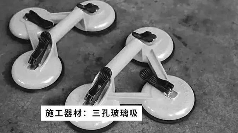 用三孔玻璃吸将大板抬到施工面,平稳放置。大板的粘贴顺序自内而外,必须保证粘结剂的饱满度。