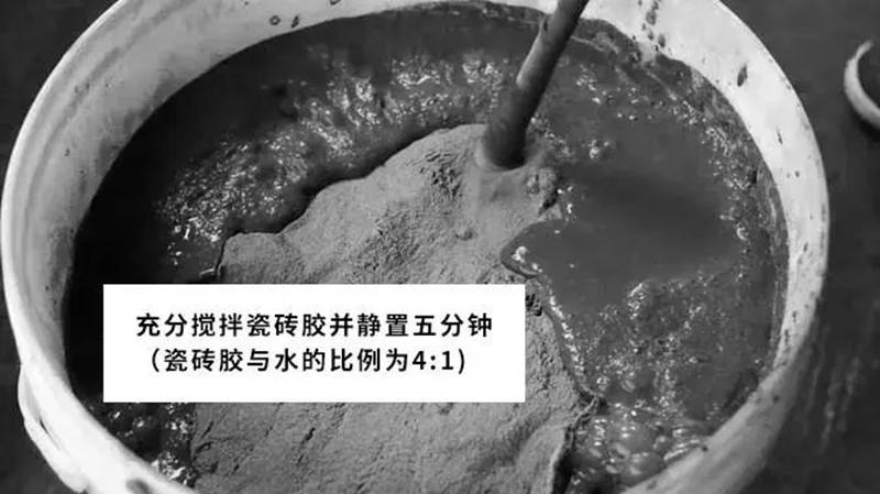 将瓷砖粘结剂与水进行4:1配置,用灰勺搅拌至润滑均匀,