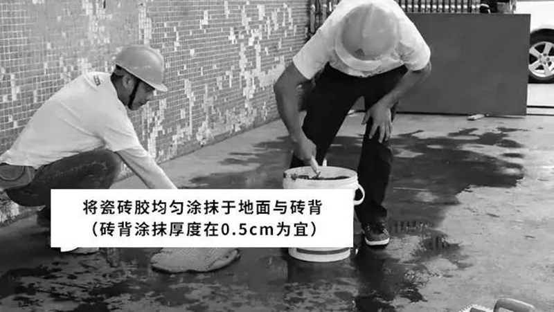 厚度为0.5CM左右。适当条件下,可同时将瓷砖粘结剂均匀地抹在瓷砖背面,力求瓷砖粘结剂涂抹饱满。