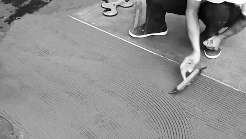 所要铺贴的位置与瓷砖背面需朝同一方向刮,便于空气排出,避免造成空鼓开裂等问题。