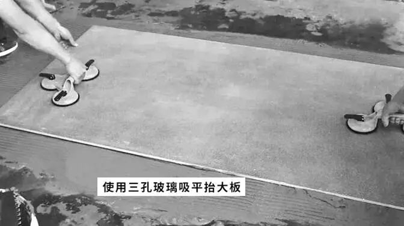 为了避免出现空鼓现象,在大板粘贴时应使用适当规格的定位器,保证留缝的宽度一致,大板瓷砖需用强力吸盘来辅助下地。