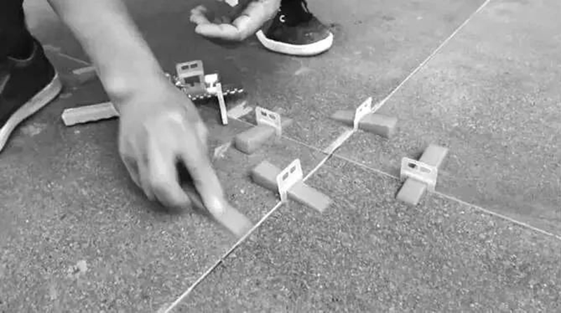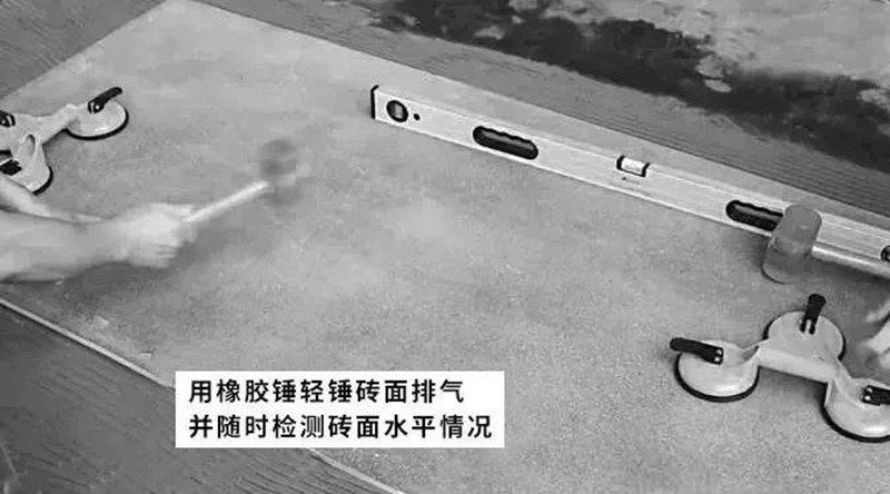 轻敲砖面,让砖底能全面吃浆,以免产生空鼓现象。用木锤把砖面敲平整的同时,以靠尺测量,确保瓷砖铺贴水平情况。