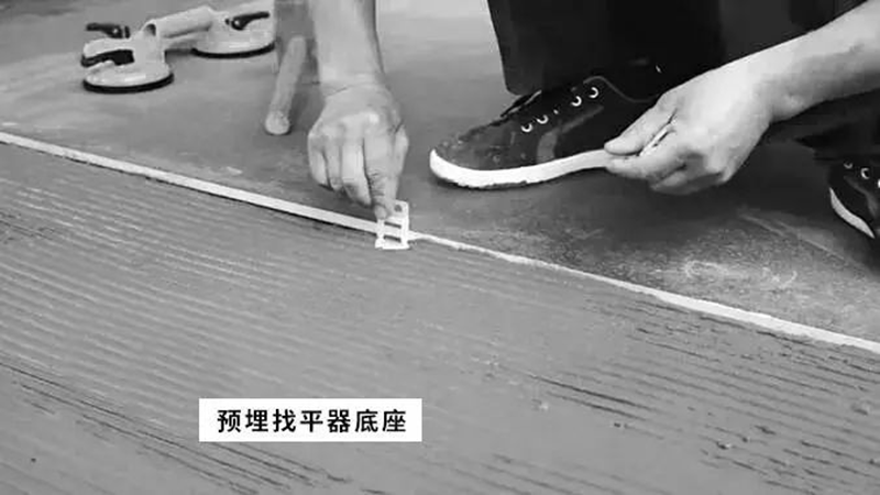在已定位好的大板边缘周围每60cm左右插入找平器底座,检验平整后插入找平楔子并夹紧找平器,